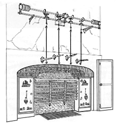 Here is a miniture example of open fire cooking from Sussex Crafts, note the fire dogs and spit with clockwork truning chain, fire back (to protect the brickwork from the heat of the fire) and the chimney crane for carrying pots. It's pretty much the arrangement I have in my dollshouse kitchen.